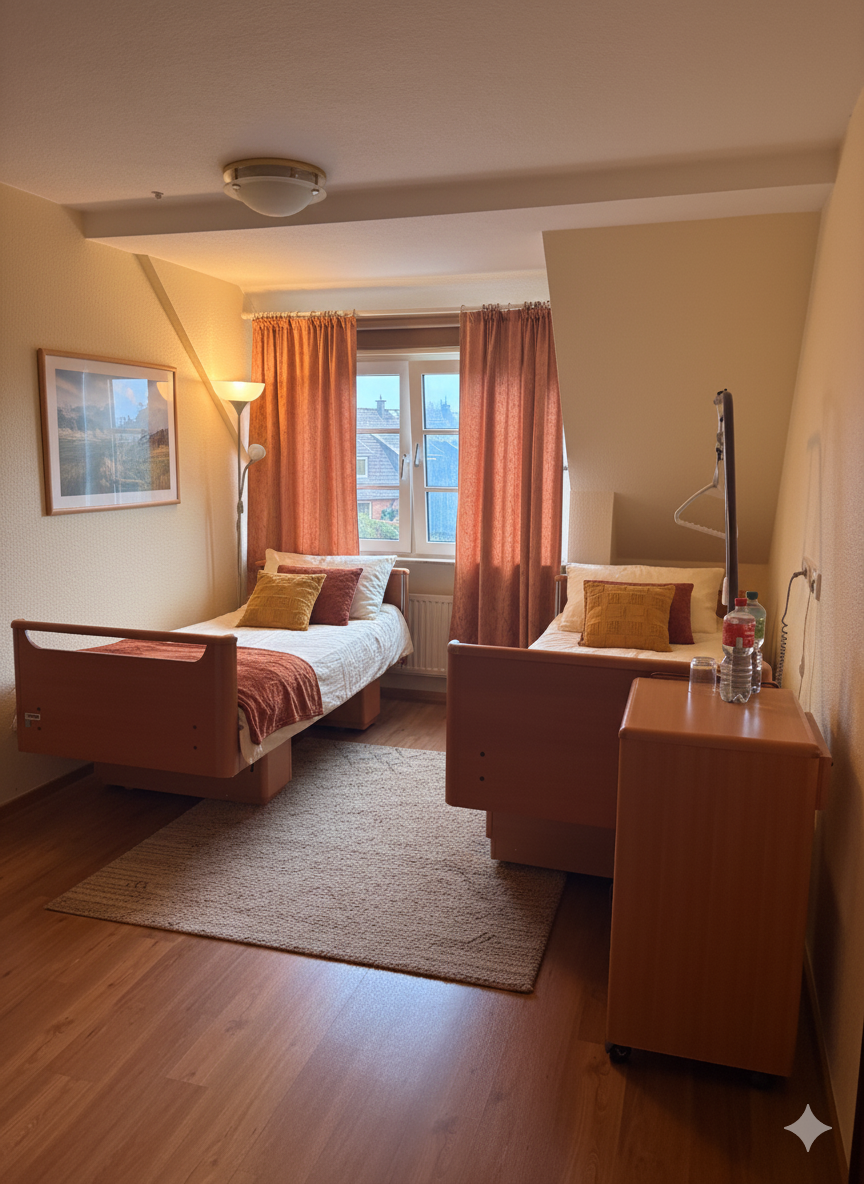Wir bieten sowohl Einzel- als auch Doppelzimmer, die hell, komfortabel und funktional gestaltet sind. Zur festen Ausstattung zählen ein Pflegebett, ein Nachtschrank, Tisch und Stühle, eine Garderobe sowie ein Telefonanschluss. Auf Wunsch stellen wir Ihnen auch WLAN zur Verfügung. Damit Sie sich wirklich zuhause fühlen, können Sie Ihr Zimmer mit eigenen Möbeln, Bildern und persönlichen Erinnerungsstücken individuell gestalten.
